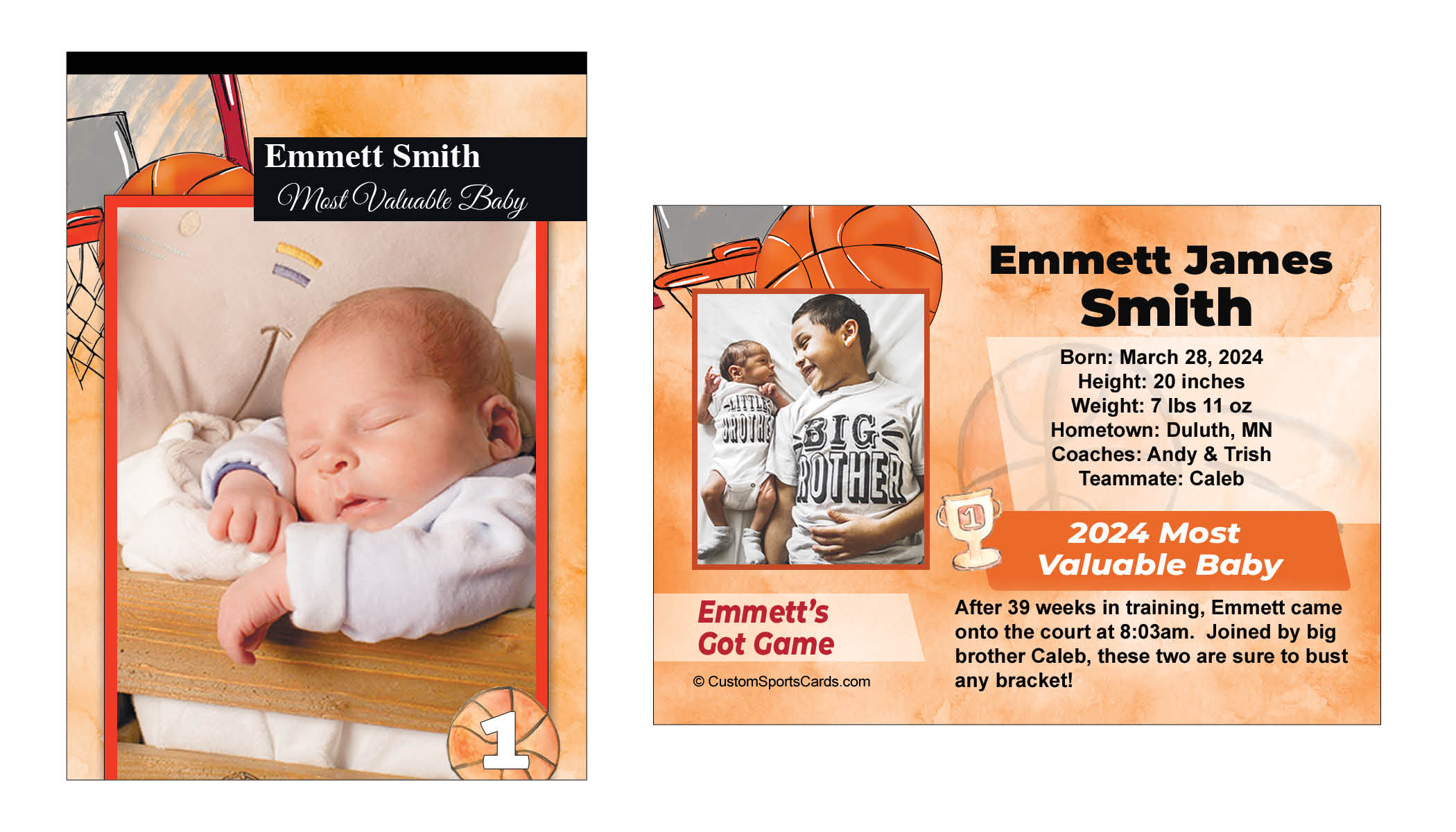 Celebrate your baby’s debut with a Rookie Card Basketball Trading Card Birth Announcement, the perfect blend of personal touch and sports-themed excitement. Order yours today and make your Sports-Themed Birth announcement a home run! Perfect for basketball-loving families, this unique Basketball baby birth announcement transforms your baby’s arrival into a collectible keepsake.