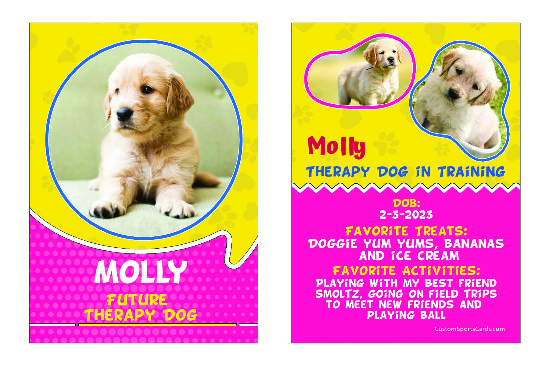 Perfect for therapy visits to hospitals, senior centers, and schools—or simply as keepsakes for proud pet parents—our dog trading cards let you highlight your dog’s photo, name, favorite activities, and fun facts. Even if your dog is a lovable rescue or family companion, these cards make it easy to showcase their role in your life and spread smiles wherever you go.